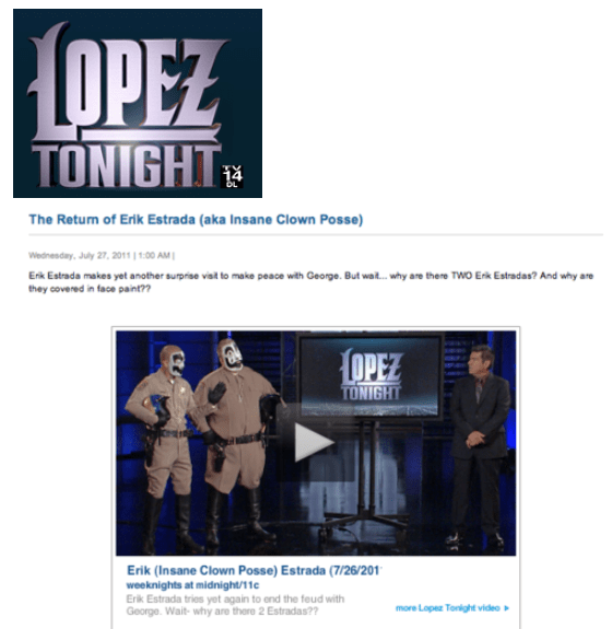 Lopez Tonight: Insane Clown Posse Guest on the show Posted by reneepublicityplease on September 11, 2011September 30, 2020 On Lopez Tonight. Share this: Share on X (Opens in new window) X Share on Facebook (Opens in new window) Facebook Like Loading... Related