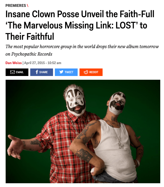 SPIN Magazine: Insane Clown Posse Interview Posted by reneepublicityplease on September 11, 2015October 1, 2020 On SPIN. Share this: Click to share on X (Opens in new window) X Click to share on Facebook (Opens in new window) Facebook Like Loading... Related