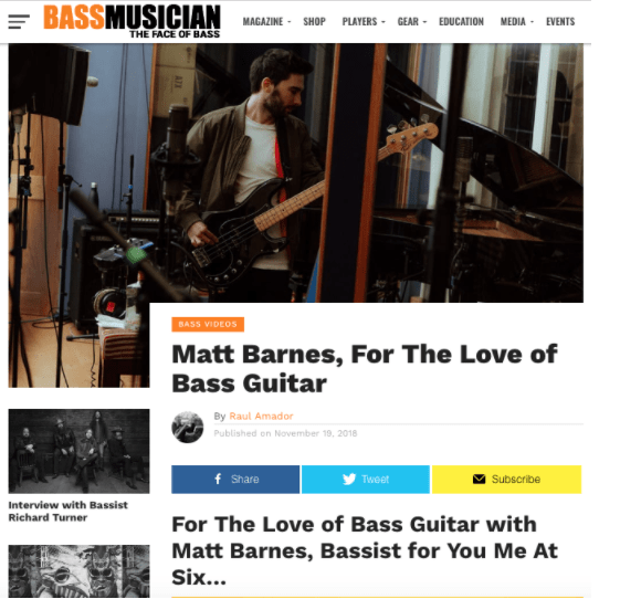 Bass Musician Magazine: Interview with Matt Barnes of You Me At Six Posted by reneepublicityplease on September 9, 2018October 1, 2020 Matt Barnes, For The Love of Bass Guitar Share this: Share on X (Opens in new window) X Share on Facebook (Opens in new window) Facebook Like Loading... Related