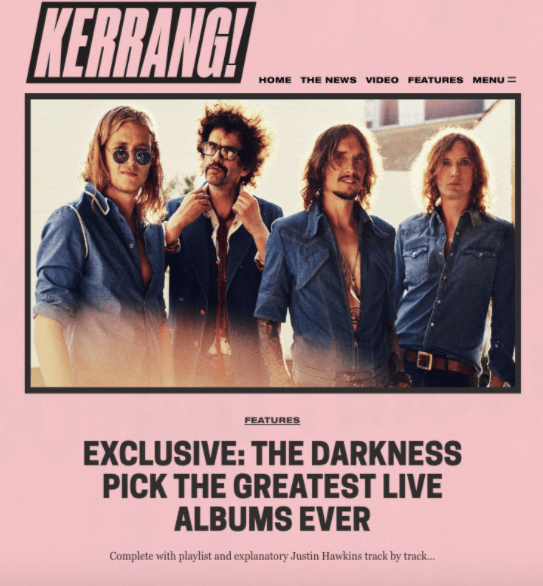 Kerrang: The Darkness Talk Greatest Live Albums Posted by reneepublicityplease on September 9, 2018October 1, 2020 More in Kerrang. Share this: Share on X (Opens in new window) X Share on Facebook (Opens in new window) Facebook Like Loading... Related