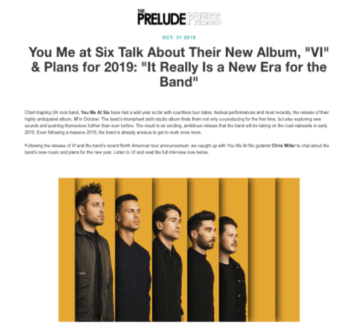 Prelude Press: You Me At Six Interview Posted by reneepublicityplease on September 9, 2018October 1, 2020 Read the Prelude Press interview. Share this: Share on X (Opens in new window) X Share on Facebook (Opens in new window) Facebook Like Loading... Related