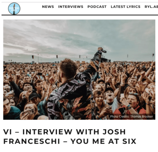 Rock Your Lyrics: You Me At Six Posted by reneepublicityplease on September 9, 2018October 1, 2020 VI – Interview with Josh Franceschi – YOU ME AT SIX Share this: Share on X (Opens in new window) X Share on Facebook (Opens in new window) Facebook Like Loading... Related