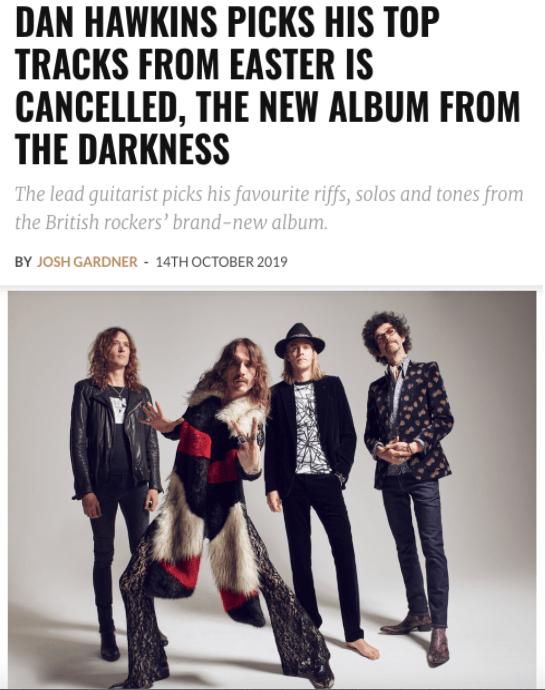 Guitar.com: Dan Hawkins of The Darkness Picks His Top Tracks from “Easter Is Cancelled” Posted by reneepublicityplease on September 9, 2019January 21, 2021 Dan Hawkins picks his top tracks from Easter Is Cancelled, the new album from The Darkness https://guitar.com/features/interviews/dan-hawkins-top-tracks-easter-is-cancelled-new-album-the-darkness/ Share this: Share on X (Opens in new window) X Share on Facebook (Opens in new window) Facebook Like Loading... Related