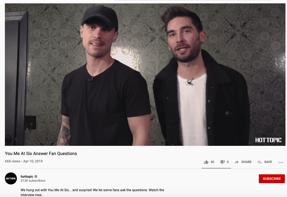 Hot Topic: Fan Interviews with Matt and Dan of You Me At Six Posted by reneepublicityplease on September 9, 2019October 1, 2020 https://www.youtube.com/watch?v=JYwUddBwE_o&app=desktop Share this: Share on X (Opens in new window) X Share on Facebook (Opens in new window) Facebook Like Loading... Related
