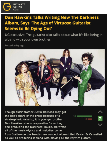 Ultimate-Guitar: Interview with Dan Hawkins of The Darkness Posted by reneepublicityplease on September 9, 2019October 1, 2020 Read the interview. Share this: Share on X (Opens in new window) X Share on Facebook (Opens in new window) Facebook Like Loading... Related