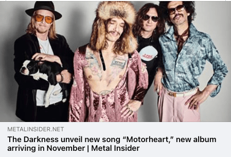 Metal Insider: The Darkness Unveil New Song “Motorheart” Posted by reneepublicityplease on August 14, 2021 More here. Share this: Share on X (Opens in new window) X Share on Facebook (Opens in new window) Facebook Like Loading... Related