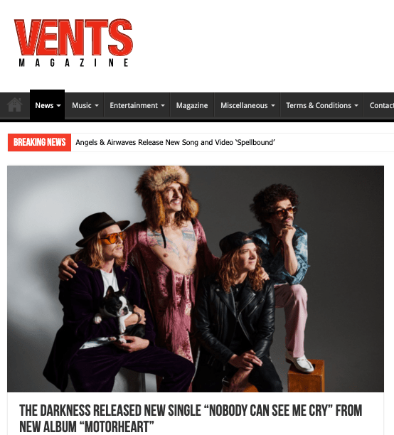 Vents Magazine: The Darkness New Song “Nobody Can See Me Cry” Posted by reneepublicityplease on September 8, 2021 Read more. Share this: Click to share on X (Opens in new window) X Click to share on Facebook (Opens in new window) Facebook Like Loading... Related