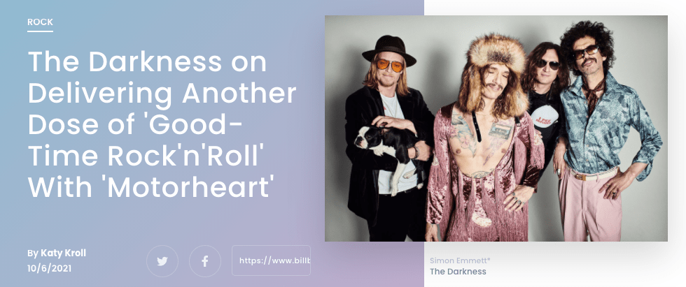 Billboard: The Darkness Deliver Another Dose of Good-Time Rock’n’Roll With Motorheart Posted by reneepublicityplease on October 6, 2021 Read more. Share this: Share on X (Opens in new window) X Share on Facebook (Opens in new window) Facebook Like Loading... Related