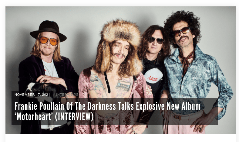 Glide Magazine: Interview with The Darkness Posted by reneepublicityplease on November 17, 2021 Read here. Share this: Share on X (Opens in new window) X Share on Facebook (Opens in new window) Facebook Like Loading... Related