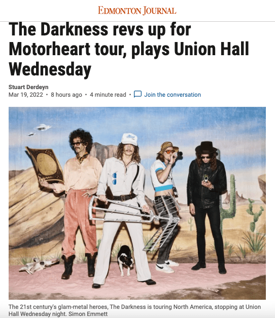 Edmonton Journal: The Darkness Motorheart Tour Posted by reneepublicityplease on March 19, 2022March 19, 2022 Read more. Share this: Click to share on X (Opens in new window) X Click to share on Facebook (Opens in new window) Facebook Like Loading... Related