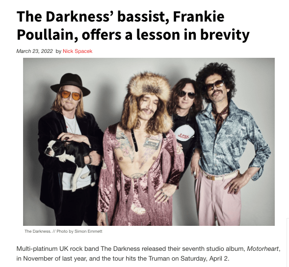 The Pitch: The Darkness Plays Kansas City Posted by reneepublicityplease on March 23, 2022 Read more. Share this: Share on X (Opens in new window) X Share on Facebook (Opens in new window) Facebook Like Loading... Related