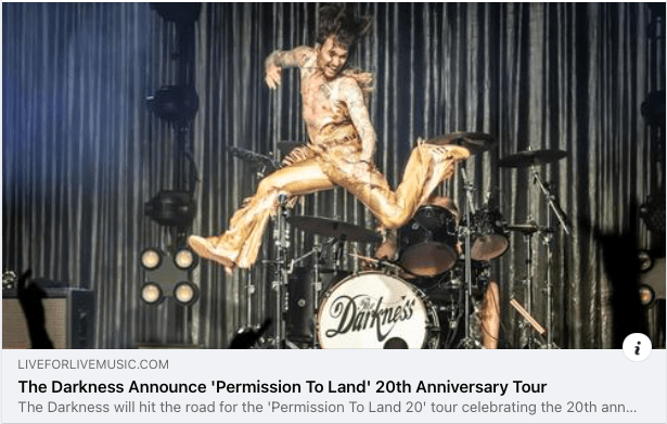 Live For Live Music: The Darkness Announce Permission To Land 20th Anniversary Tour Posted by reneepublicityplease on June 6, 2023 Read more. Share this: Share on X (Opens in new window) X Share on Facebook (Opens in new window) Facebook Like Loading... Related