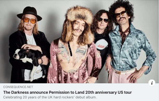 Consequence: The Darkness Announce Permission To Land 20th Anniversary Tour Posted by reneepublicityplease on June 7, 2023 Read more. Share this: Share on X (Opens in new window) X Share on Facebook (Opens in new window) Facebook Like Loading... Related